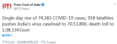 據(jù)報道,根據(jù)通報,過去24小時,印度新增74383例新冠肺炎確診病例,新增死亡病例918例,這使得該國累計新冠病例達到7053806例,其中死亡病例達到108334例。